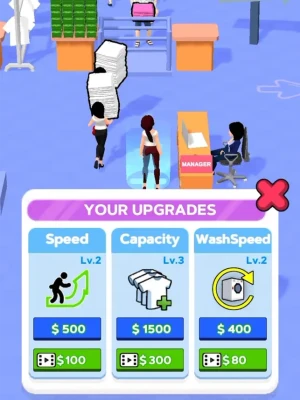Indeed, don’t forget to improve your hero skills! Go to the manager desk to increase your speed and upgrade your hero to do the laundry faster. Also, upgrade the speed of the washing machines. Wash more clothes to earn more. Money will help to grow faster and build your own laundry empire.